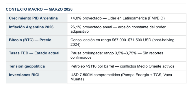Marzo de 2026 presenta un escenario aparentemente contradictorio: crecimiento económico proyectado en Argentina, inflación persistente en el bolsillo real, y un mercado global condicionado por la política monetaria de la Reserva Federal.